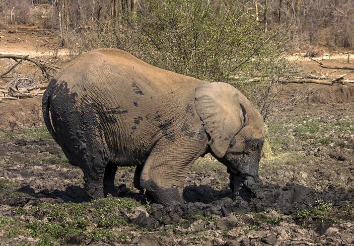 南非大象头钻泥土 模仿“鸵鸟”避暑